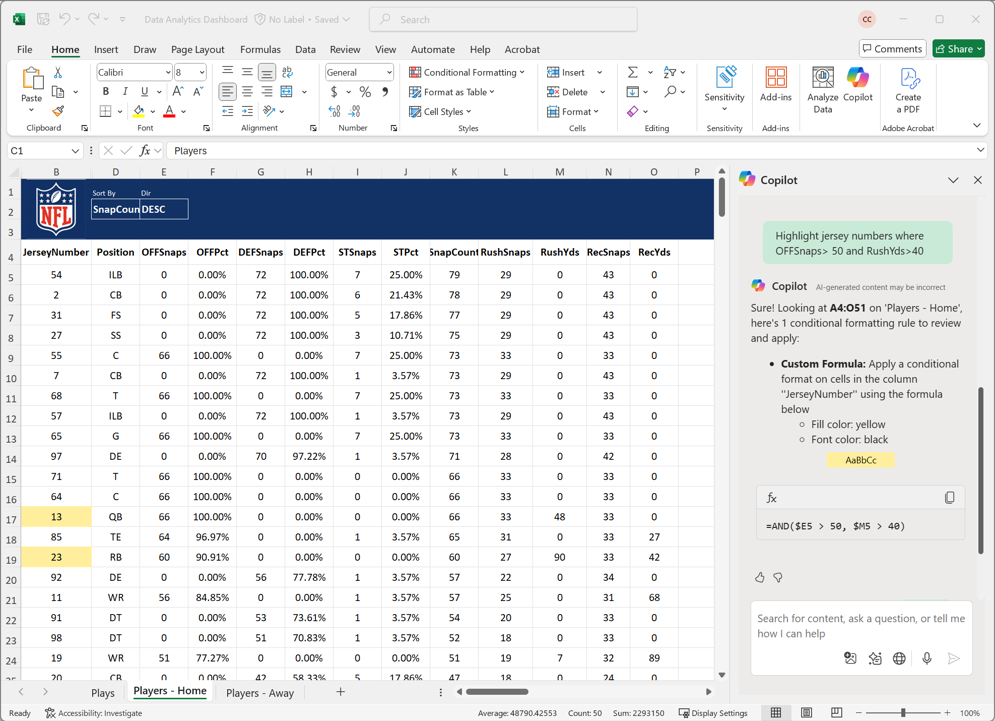 In the coaches booth, a Microsoft 365 Copilot-powered Excel dashboard helps club analysts identify actionable insights faster to influence game strategies. The analytics device supports real-time evaluation of offensive and defensive personnel groupings, snap counts, play results, yards gained, and lineup tendencies. Microsoft 365 Copilot enhances the dashboard by assisting with formula creation, data visualization, and improved data types, allowing analysts to efficiently interpret complex datasets during high pressure situations.