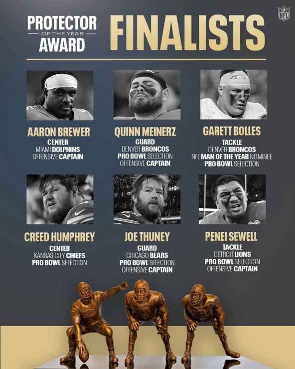 “The offensive line carries the weight of the game. Durability, endurance, leadership and consistency define their work, even when the spotlight rarely finds them,” said Troy Vincent Sr., NFL Executive Vice President of Football Operations. “Protector of the Year is about recognizing the vital role these tremendous athletes play and celebrating excellence where it starts, up front.”